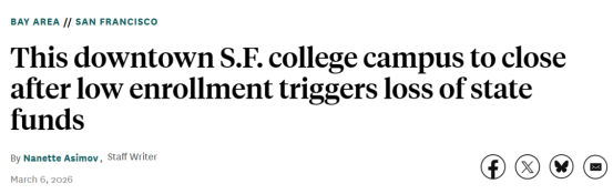 刚刚,加州旧金山城市学院【City College of San Francisco,简称 CCSF】宣布,将在今年夏天关闭市区中心校区【Downtown Center Campus】,原因是学生人数下降和资金不足。