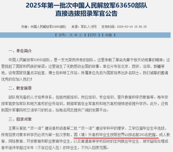 2025年第一批次中国人民解放军63650部队直接选拔招录军官公告👇