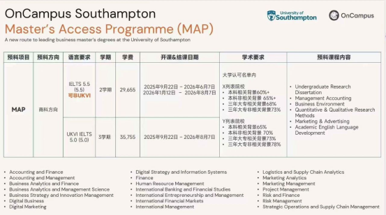 南安普顿大学商学院硕士预科(MAP)现已正式接受三年大专申请!这一政策的调整,许多拥有三年大专学历,却怀揣着硕士梦想的同学来说无疑是一个利好消息。