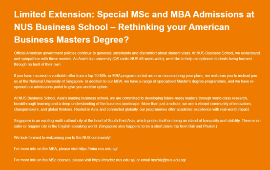 在这样的背景下,新加坡国立大学宣布:为受美国政策影响的优秀学生重新开放申请通道,并延长申请截止日期,旨在帮助已获全球顶尖院校研究生录取的学生转换学术路径,无缝衔接学业规划。
