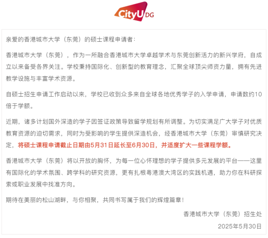 近日,香港城市大学(东莞)宣布,25Fall硕士课程申请截止日期将由5月31日延长至6月30日,并且适度扩大了一些课程的名额,为申请者提供了更为充裕的时间和更多的机会。
