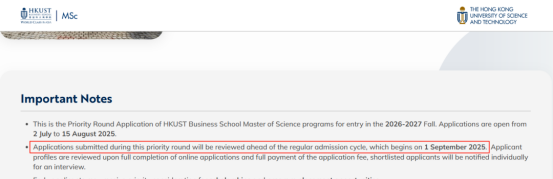 香港科技大学商学院提前批申请已于2025年8月15日截止,而常规批次申请将于2025年9月1日开放,且为滚动审核,意味这“先到先得,录满为止”。
