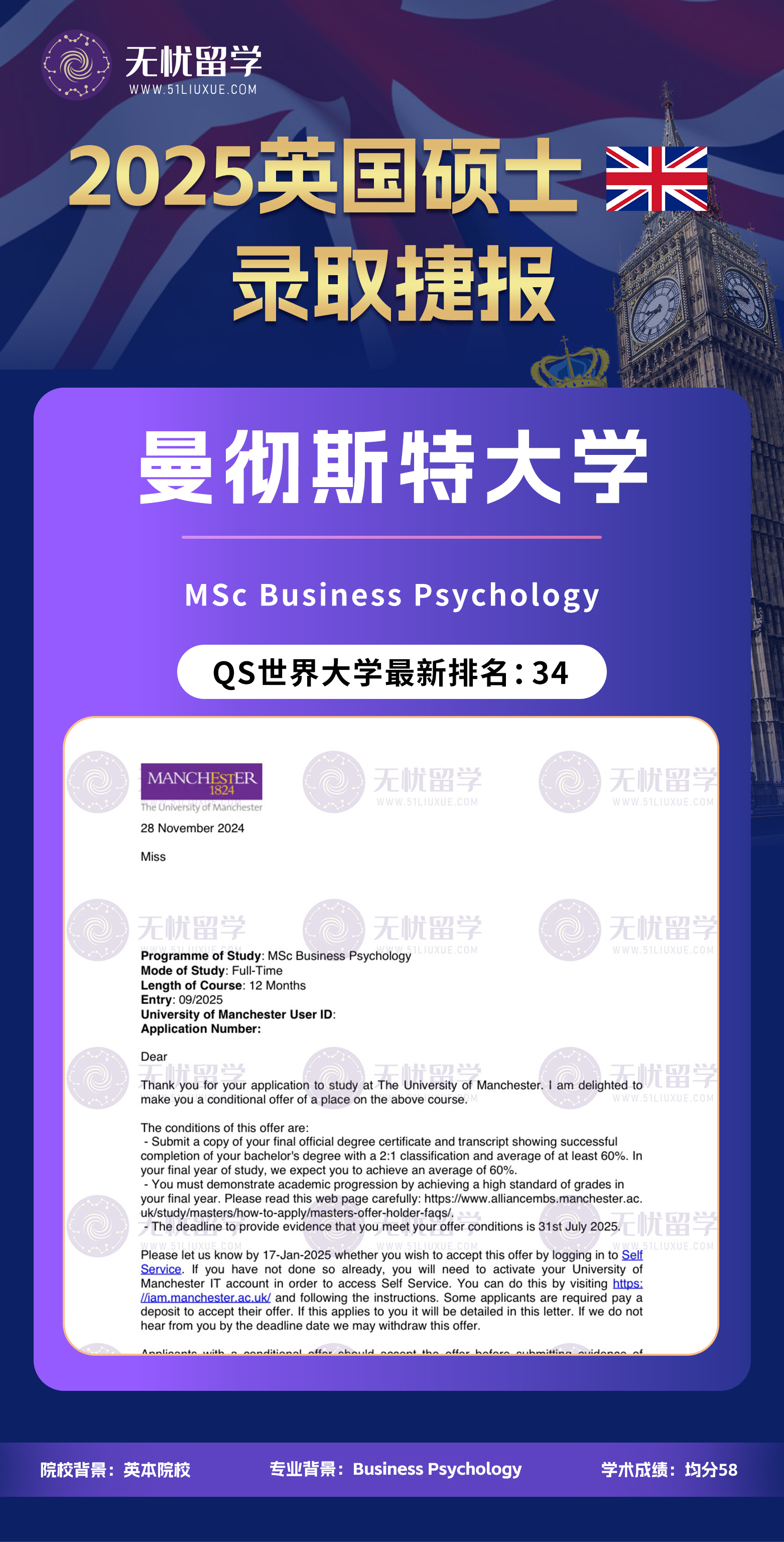 无忧留学分享:学员H同学英本院校背景,均分58,成功拿下曼彻斯特大学offer!