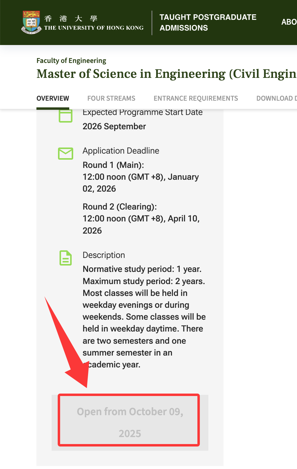注意啦!香港大学工程学院官宣26fall硕士课程于10月9日开放申请通道,第一轮将于2026年1月2日截止!