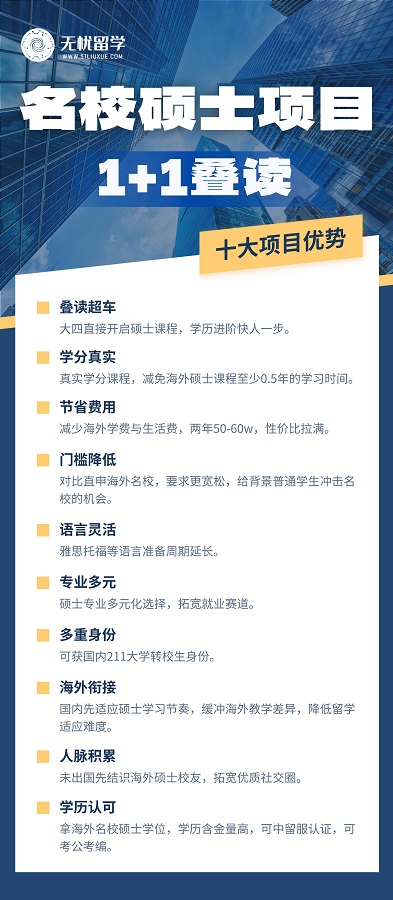 我们深知你的梦想与困境,因此重磅推出 【名校硕士1+1叠读项目】 ,这是一个专为背景稍有不足的学子设计的 “弯道超车”黄金通道!