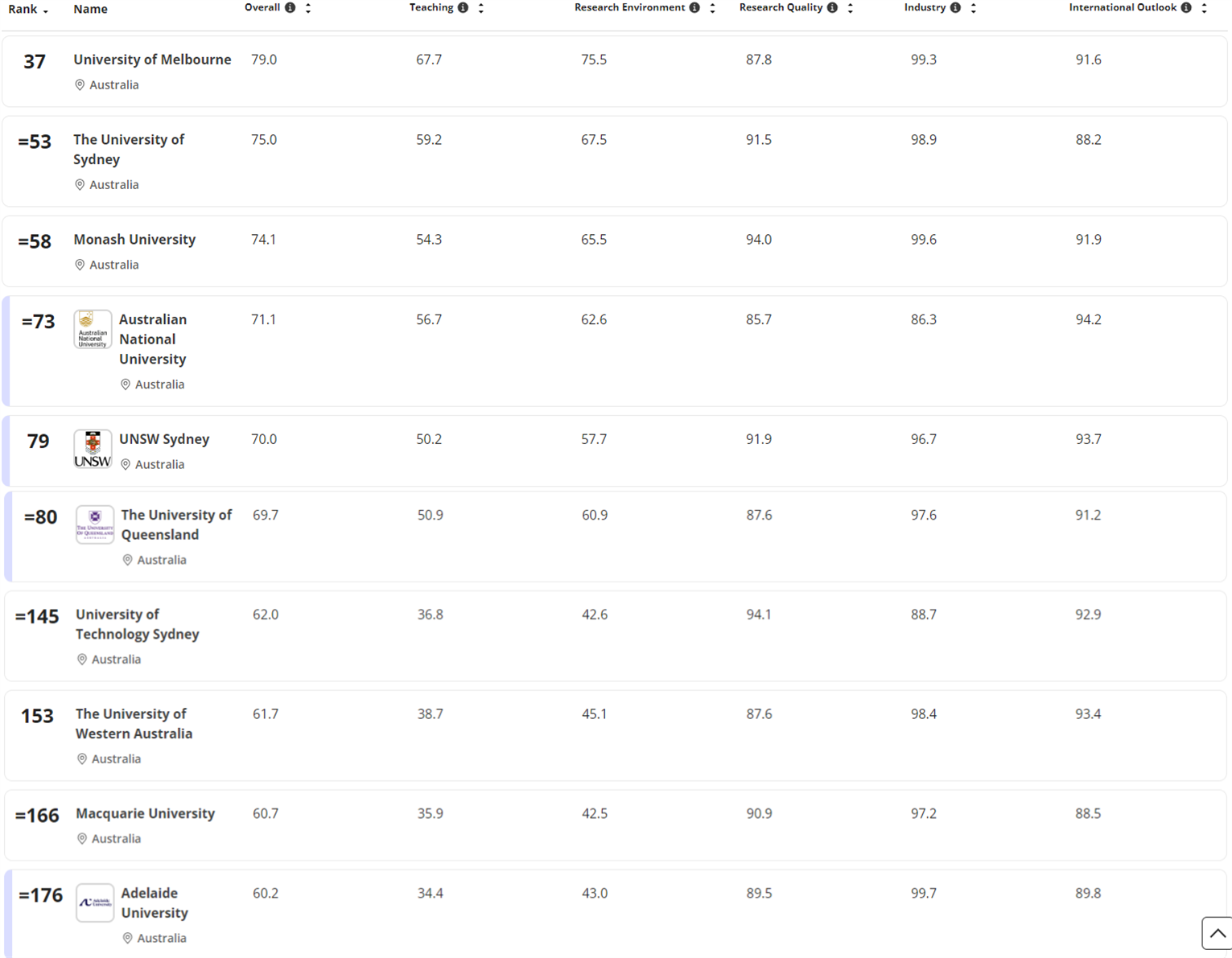 • 新南威尔士大学:稳步前进,从第83名升至第79名