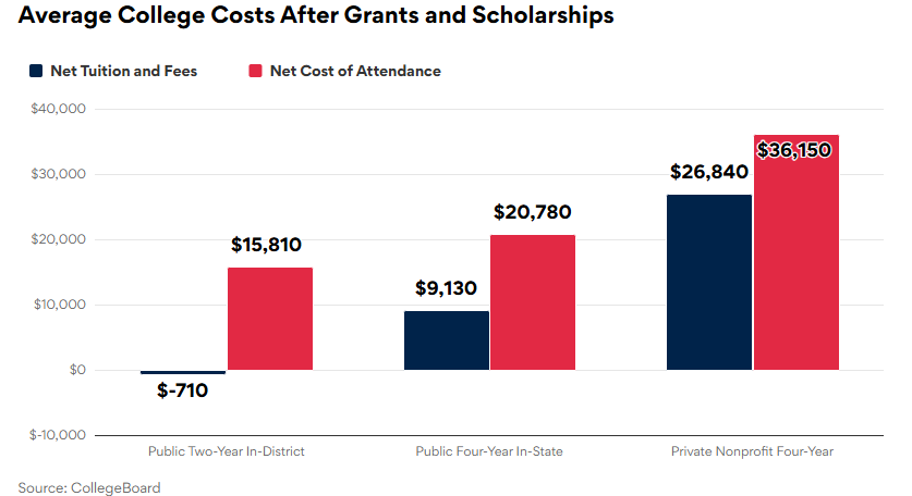 扣除助学金、助学金后,公立大学的州内平均净就读成本为20,780美元,而非营利性私立大学的平均净就读成本为36,150美元。