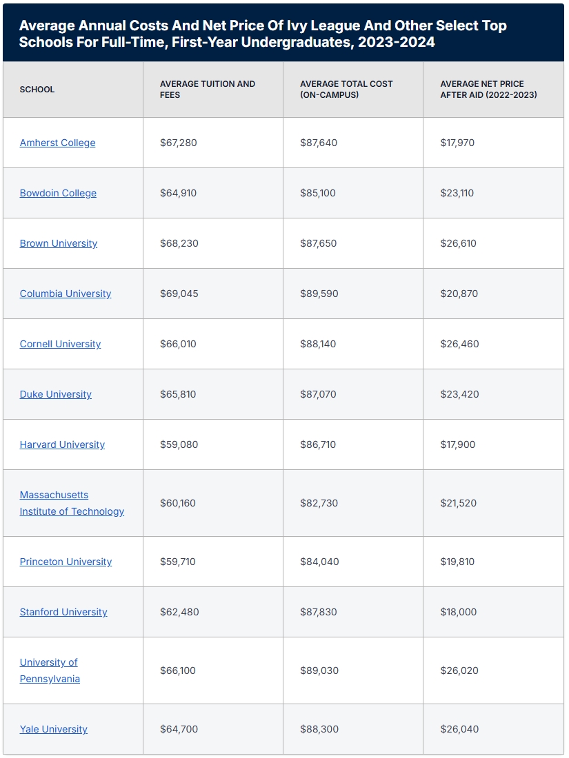 以下是美国常春藤校和一些顶尖高校的费用情况: