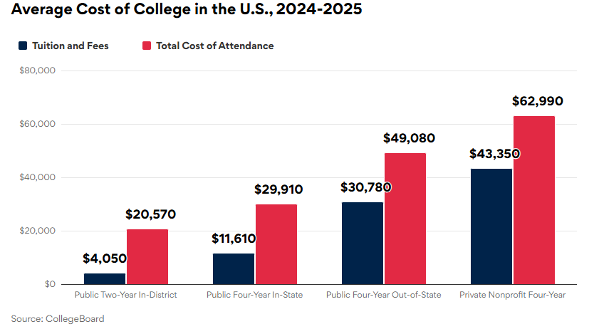 根据美国大学理事会(CollegeBoard)对各高校开展的年度调查,在2024-2025学年,公立大学的州内平均费用约为30,000美元,州外平均费用约为49,000美元,而私立大学的平均费用约为63,000美元。