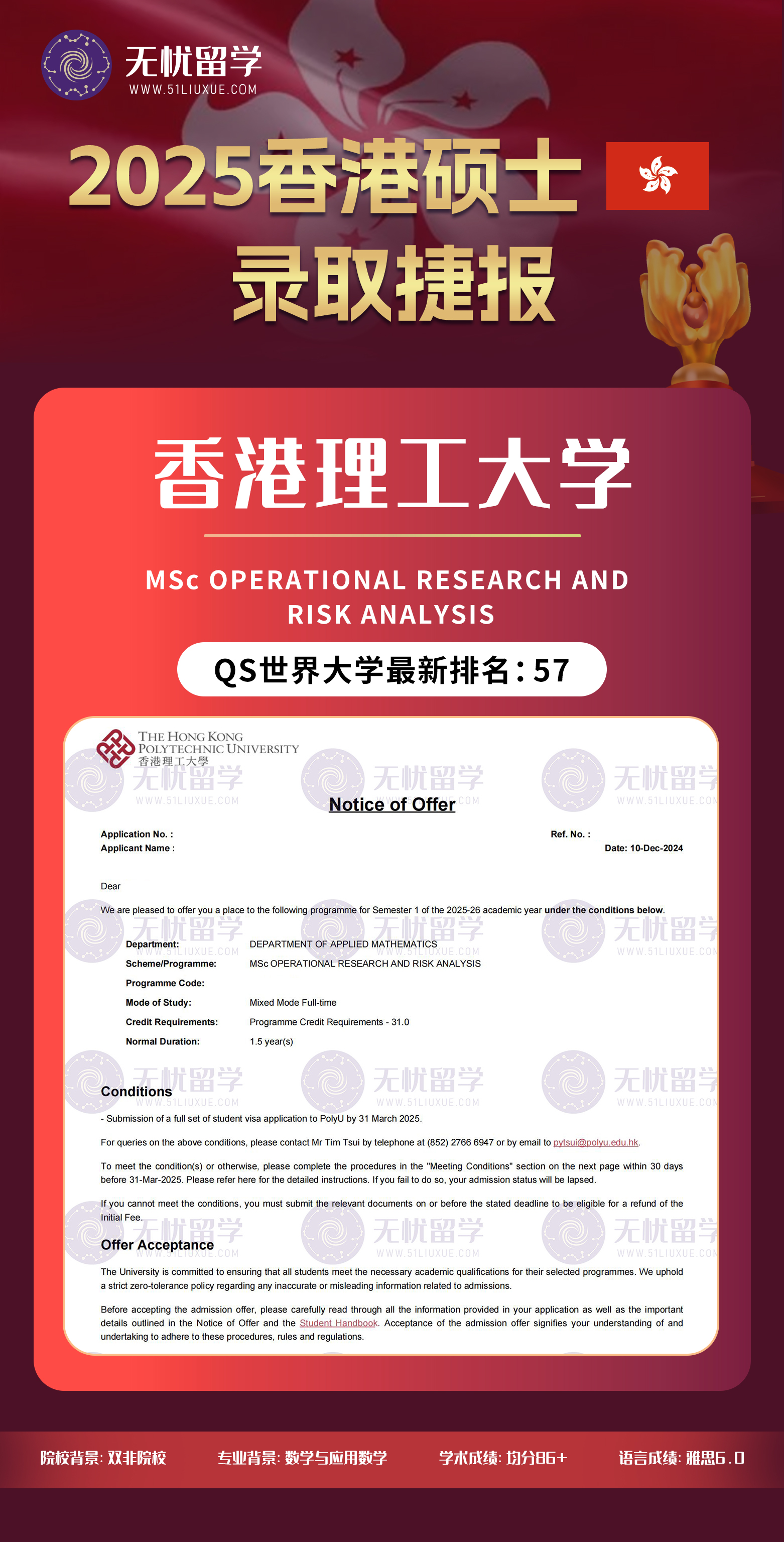 ✅无忧留学建议:学员S同学双非院校背景,数学专业均分86、雅思6.0,成功拿到香港理工大学offer。