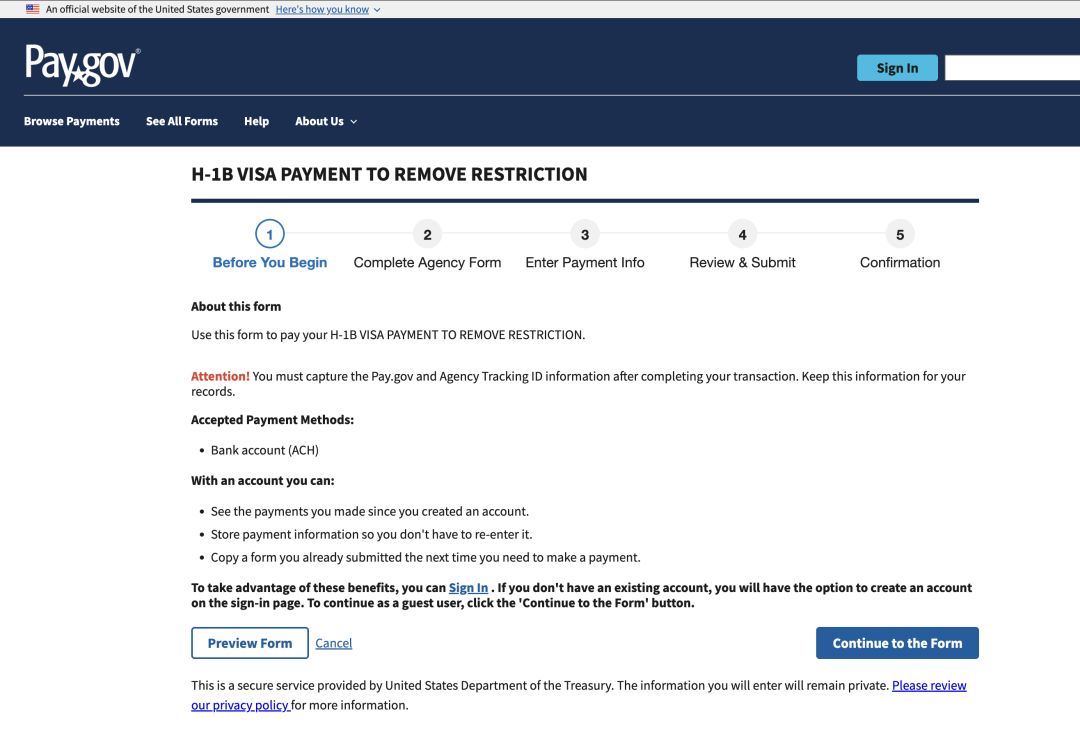 美国公民及移民服务局要求申请人通过pay.gov网站缴纳10万美元费用,具体操作请遵循网站:https://www.pay.gov/public/form/start/1772005176 上的说明。