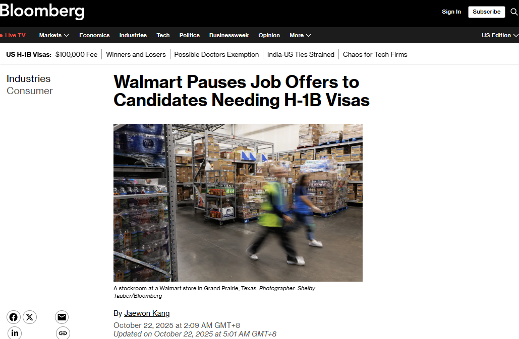 以雇佣大量H-1B员工的公司为例,如亚马逊、高知特和塔塔咨询,即使仅部分员工需缴费,其总支出也将极为庞大。新规公布当日,沃尔玛便立即暂停了为需要H-1B签证的候选人提供担保。