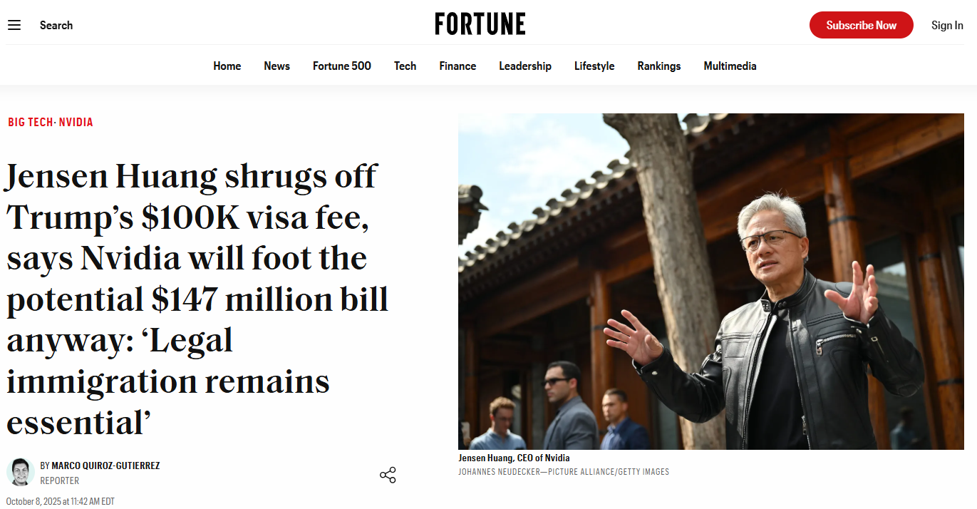 然而,部分硅谷巨头则持不同立场。英伟达(Nvidia)宣布将继续为H-1B申请者提供担保并承担所有费用。公司首席执行官、移民出身的黄仁勋在内部备忘录中强调,“移民是美国梦的基础”,彰显了其对全球人才的支持。