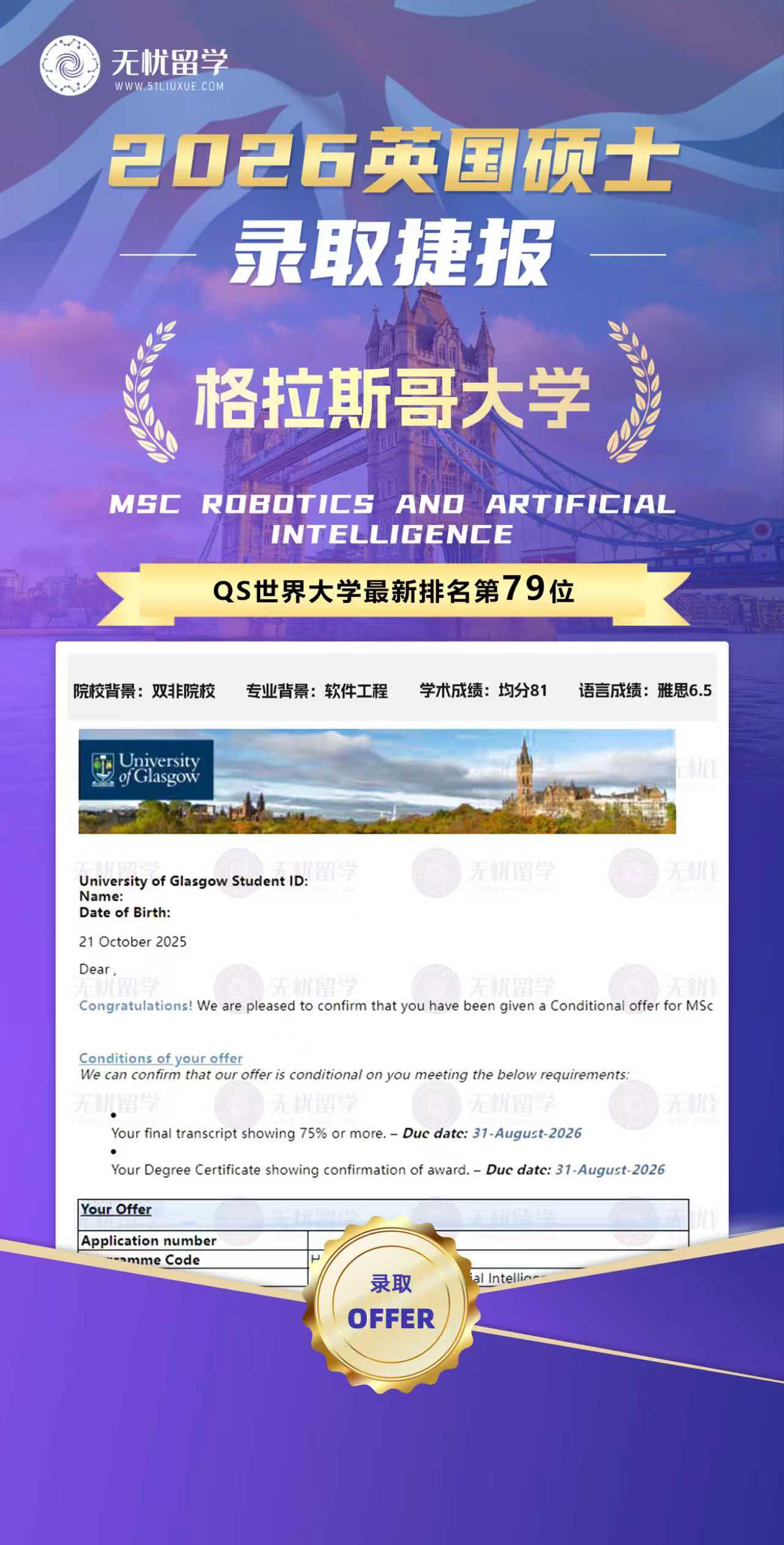 无忧留学分享:学员L同学双非院校背景,均分81、雅思6.5,成功拿到26fall格拉斯哥大学硕士offer。