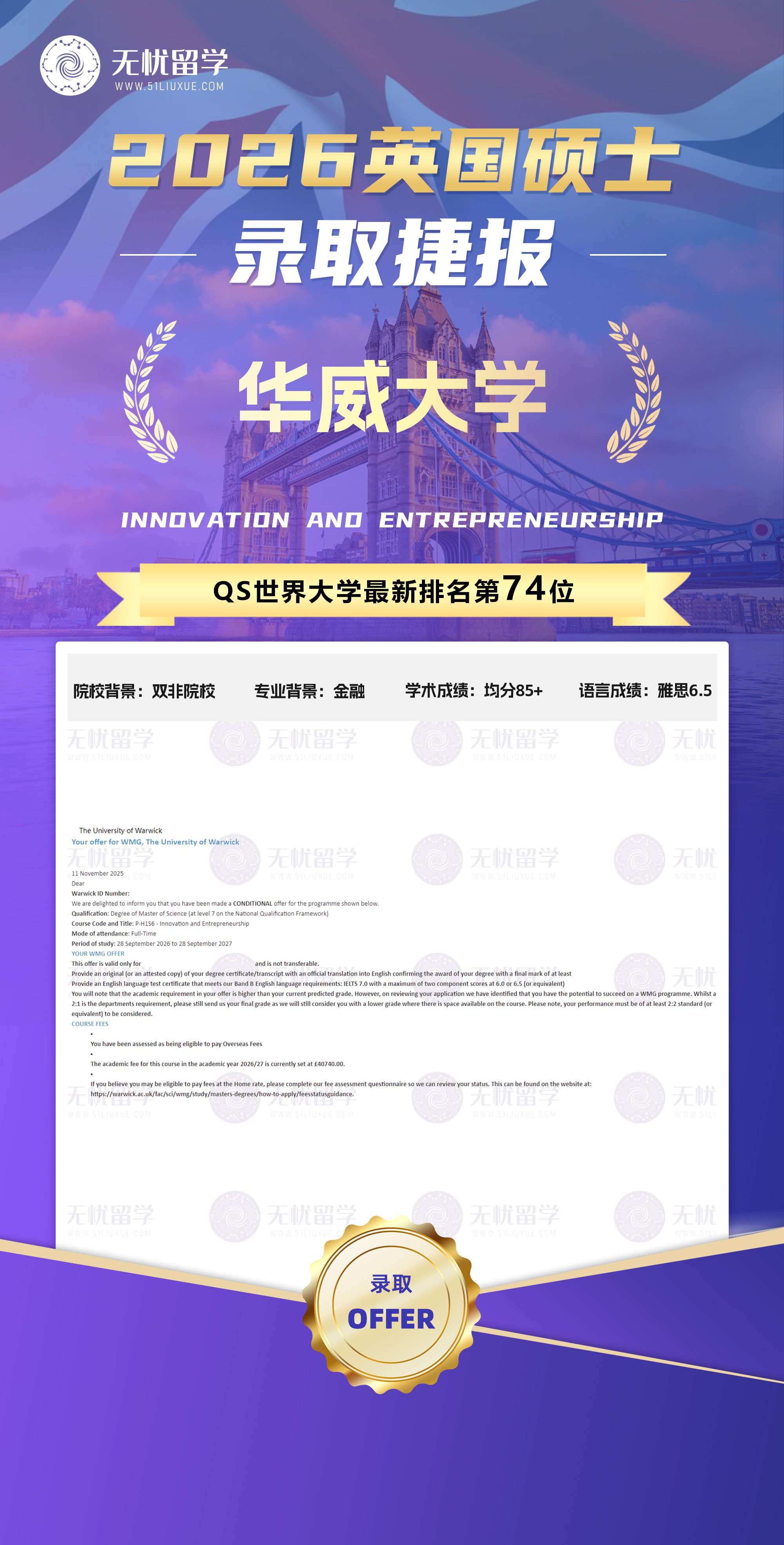 无忧留学分享:学员L同学双非院校背景,均分85、雅思6.5,成功拿到华威大学大学硕士offer。
