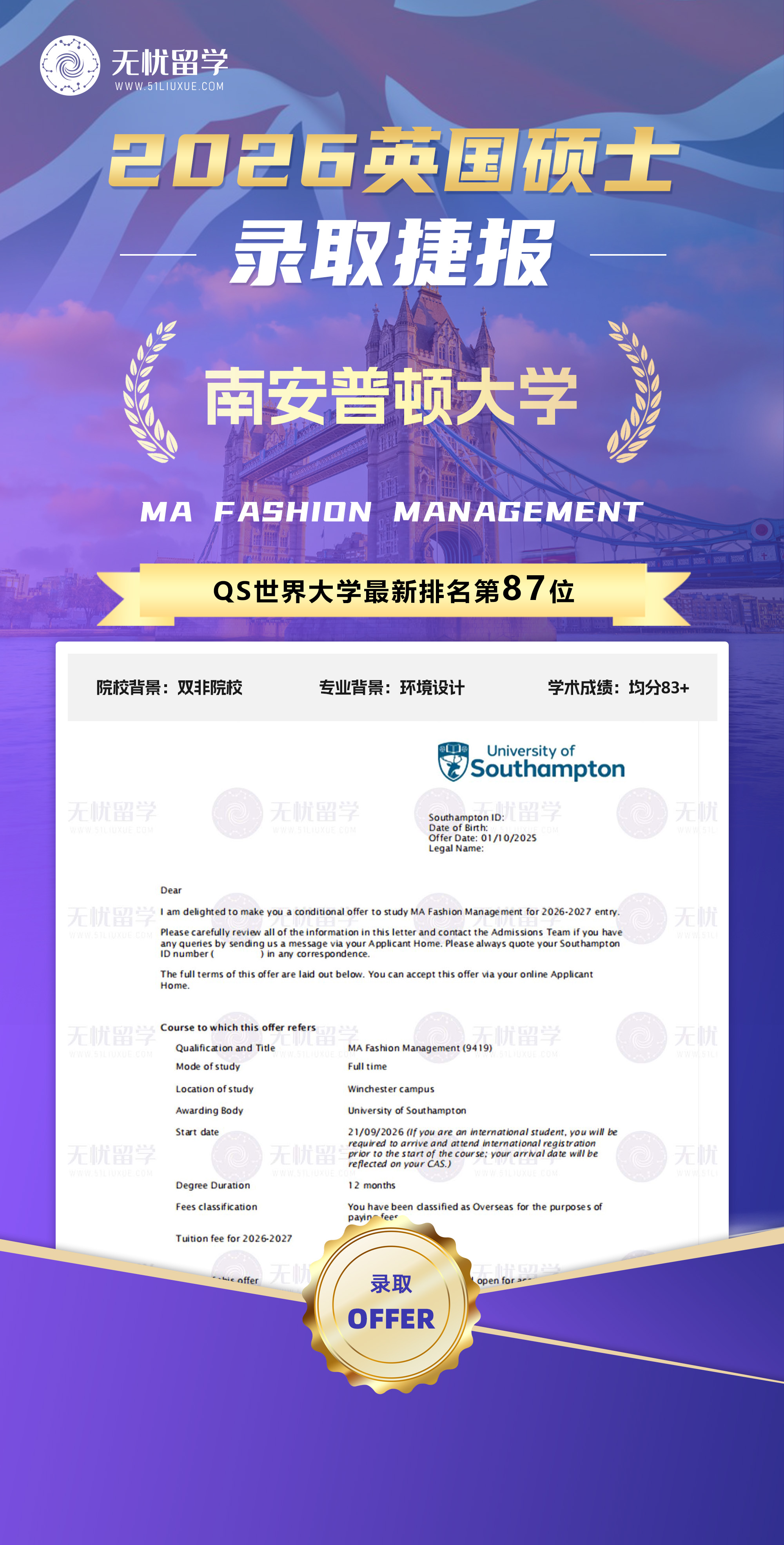 无忧留学分享:学员H同学双非院校背景,均分83、雅思7.0,成功拿到26fall南安普顿大学硕士offer。