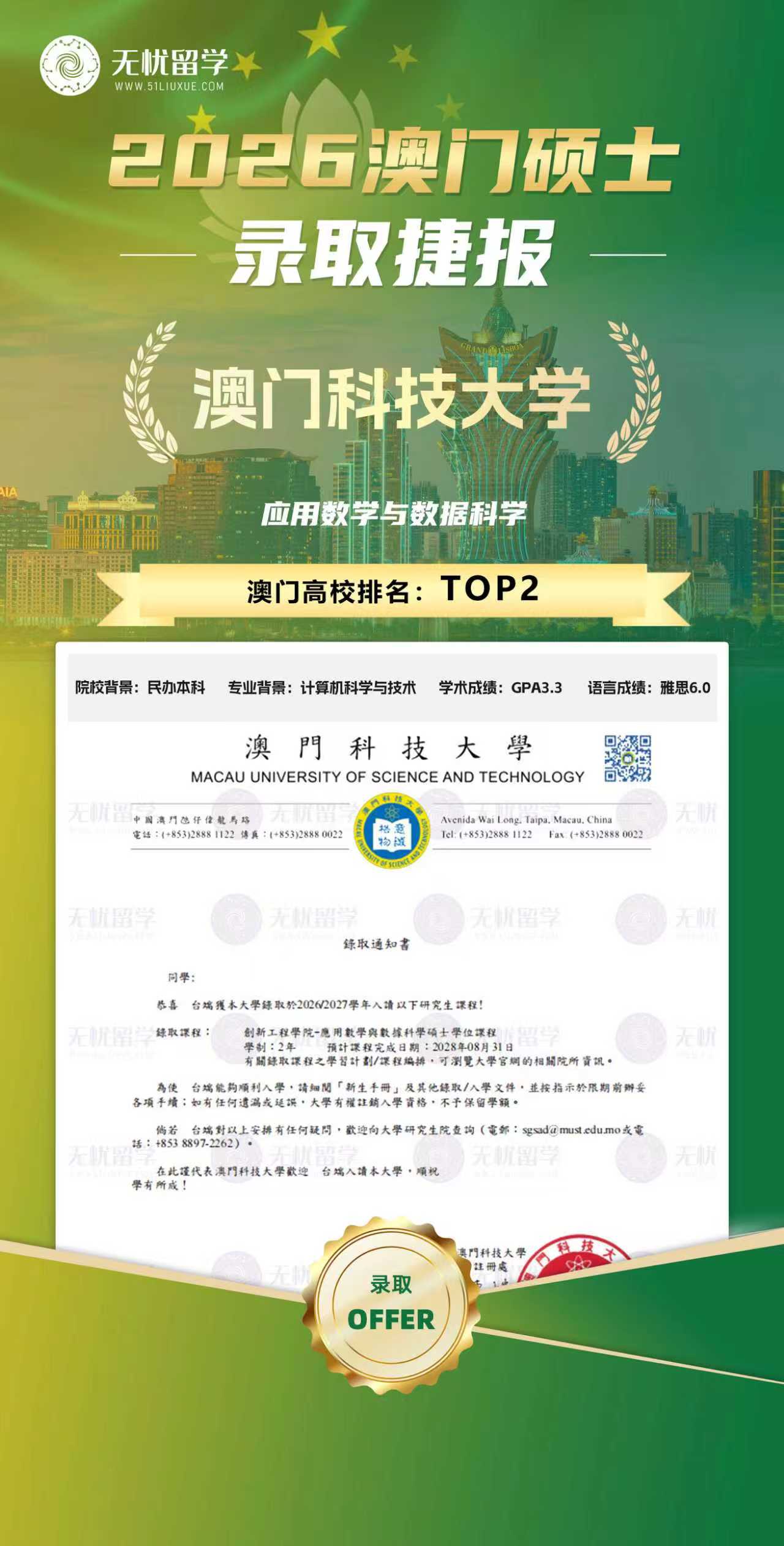 无忧留学聚焦澳门硕士申请核心需求,打造专属服务体系,核心优势凸显。一是院校资源深厚,与澳门大学、澳门科技大学、澳门理工大学、澳门城市大学等所有主流院校建立深度合作,可获取最新申请政策、院校录取偏好,精准匹配院校与专业;二是定制化申请方案,结合每一位学子的本科背景、考研成绩、职业规划,量身定制申请方案,针对跨专业、低均分、无语言成绩等特殊情况,最大化提升录取成功率;三是全程一对一服务,配备资深申请顾问、文书老师,从材料准备、文书撰写、网申提交,到笔面试辅导、签证办理、住宿安排,全程一对一跟进,全程透明可查,无需学子费心;四是售后保障完善,对接澳门本地住宿,帮助学子快速适应澳门学习生活,解决学子各类突发问题;五是费用透明可控,无任何隐形消费,合同明确服务内容,让学子和家长放心,真正实现“无忧申请、轻松上岸”。