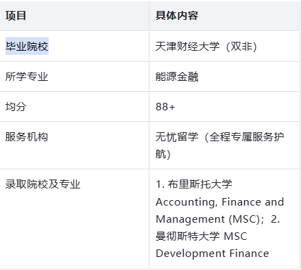 英国商科作为常年热门申请方向,竞争激烈程度再创新高。尤其是罗素集团顶尖院校的商科专业,不仅对申请者的均分、专业背景有严苛要求,更看重综合能力与申请材料的适配度,双非院校申请者想要脱颖而出,难度不言而喻。来自天津财经大学能源金融专业的李同学,凭借均分88+的成绩,在无忧留学的全程专业护航下,成功斩获布里斯托大学、曼彻斯特大学两大顶尖院校商科offer,用实力证明“双非背景也能解锁英国名校商科赛道”。今天,我们复盘李同学的申请全过程,拆解无忧留学如何凭借定制化服务与专业优势,助力双非学子在商科申请中突围。布里斯托大学Accounting, Finance and Management (MSC)专业,作为该校商科热门方向,明确要求申请者具备商科相关背景,均分要求85+(双非院校隐性要求88+);曼彻斯特大学MSC Development Finance专业,隶属于发展政策与管理学院,融合金融与发展经济学,对申请者的专业适配度、逻辑思维能力要求极高,双非申请者需具备突出的均分与综合背景,才能获得审核官青睐。