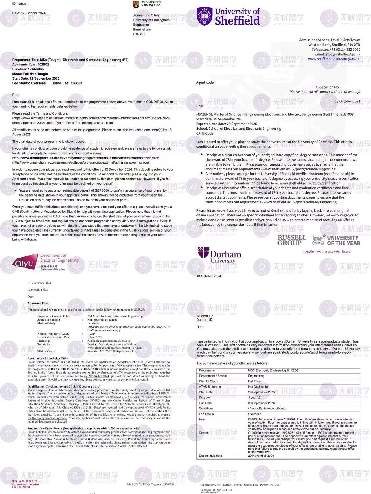 越来越多学子选择英国+香港留学混合申请模式,既追求英伦顶尖学术氛围,又兼顾香港的地域优势与就业前景,实现“双线并行、双向兜底”的申请目标。中国传媒大学电子信息工程专业的袁同学,便是这一趋势下的受益者。凭借211本科背景,但均分仅78分的成绩,在无忧留学的全程护航下,成功斩获谢菲尔德大学、杜伦大学、伯明翰大学3所英国顶尖院校,以及香港城市大学的硕士offer,用实力打破均分短板的局限,圆满实现留学梦想。今天,我们就以袁同学的案例为切入点,复盘英港混申的核心逻辑,解读无忧留学如何以专业服务,为学子铺就名校之路。袁同学的申请痛点十分典型,电子信息工程专业属于热门工科竞争激烈,且英港两地院校对专业课程的侧重点不同,英国院校更注重理论深度与实践结合,香港院校则更偏向应用能力与就业导向,如何精准匹配两地申请需求,成为申请成功的关键。此外,袁同学在初期对院校选择、专业定位、申请流程均较为迷茫,迫切需要专业团队的指导,这也是他选择无忧留学的核心原因。