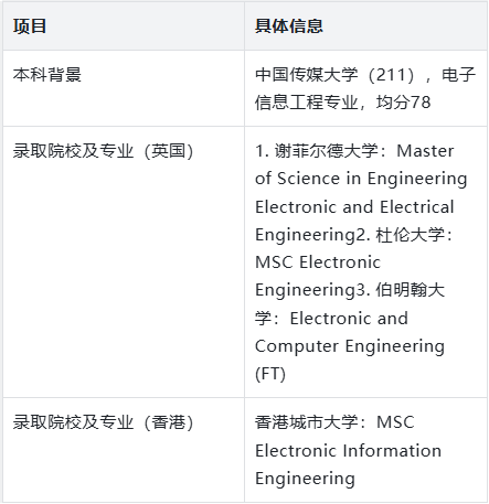针对袁同学的情况,顾问团队第一时间开展深度沟通,全面梳理其学术背景、专业优势、职业规划,同时结合25fall英港两地电子信息类专业的申请趋势、院校录取偏好,为其制定了梯度分明、双向兜底的混申方案。英国方向,结合袁同学的专业筛选出对211院校背景较为认可、且允许均分适当浮动的顶尖院校:谢菲尔德大学的电子与电气工程硕士(MSc Electronic and Electrical Engineering),该专业经工程技术学会(IET)认证;杜伦大学的电子工程硕士(MSC Electronic Engineering),作为罗素集团核心院校,其电子工程专业注重科研实践,适合有一定学术基础的学子;伯明翰大学的电子与计算机工程硕士(Electronic and Computer Engineering),课程涵盖数字设计、软件系统等核心模块,就业导向明确。香港方向,结合袁同学希望兼顾地域优势与就业前景的需求,重点锁定香港城市大学的电子信息工程硕士(MSC Electronic Information Engineering),该专业贴合内地就业市场需求,且对211院校背景的学子较为青睐,英语要求相对灵活。详细解读了各院校的申请要求、课程设置、就业前景,结合其职业规划,分析每所院校的专业优势,帮助袁同学清晰了解每一个申请选项的价值,避免盲目申请。
