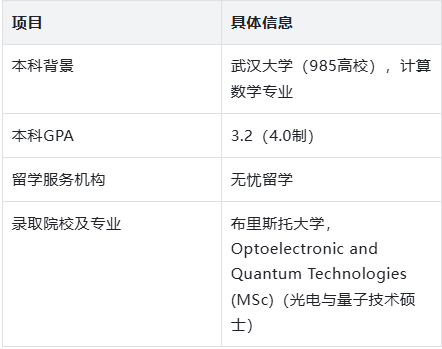 在竞争愈发激烈的英硕申请赛道上,“高分内卷”、“背景同质化”成为常态,不少拥有优质本科背景的学子,也会因GPA瓶颈、专业定位模糊等问题陷入申请迷茫。来自武汉大学计算数学专业的陈同学,985名校加持却受限于3.2的GPA,在跨专业申请热门领域时屡屡碰壁,最终在无忧留学的全程护航下,成功斩获布里斯托大学光电与量子技术硕士offer。陈同学的案例,不仅是一次个人申请的成功,更是无忧留学以学生为中心,用专业破解申请痛点的生动缩影,也为后续计划申请英国硕士的学子,提供了可借鉴的选题与申请思路。