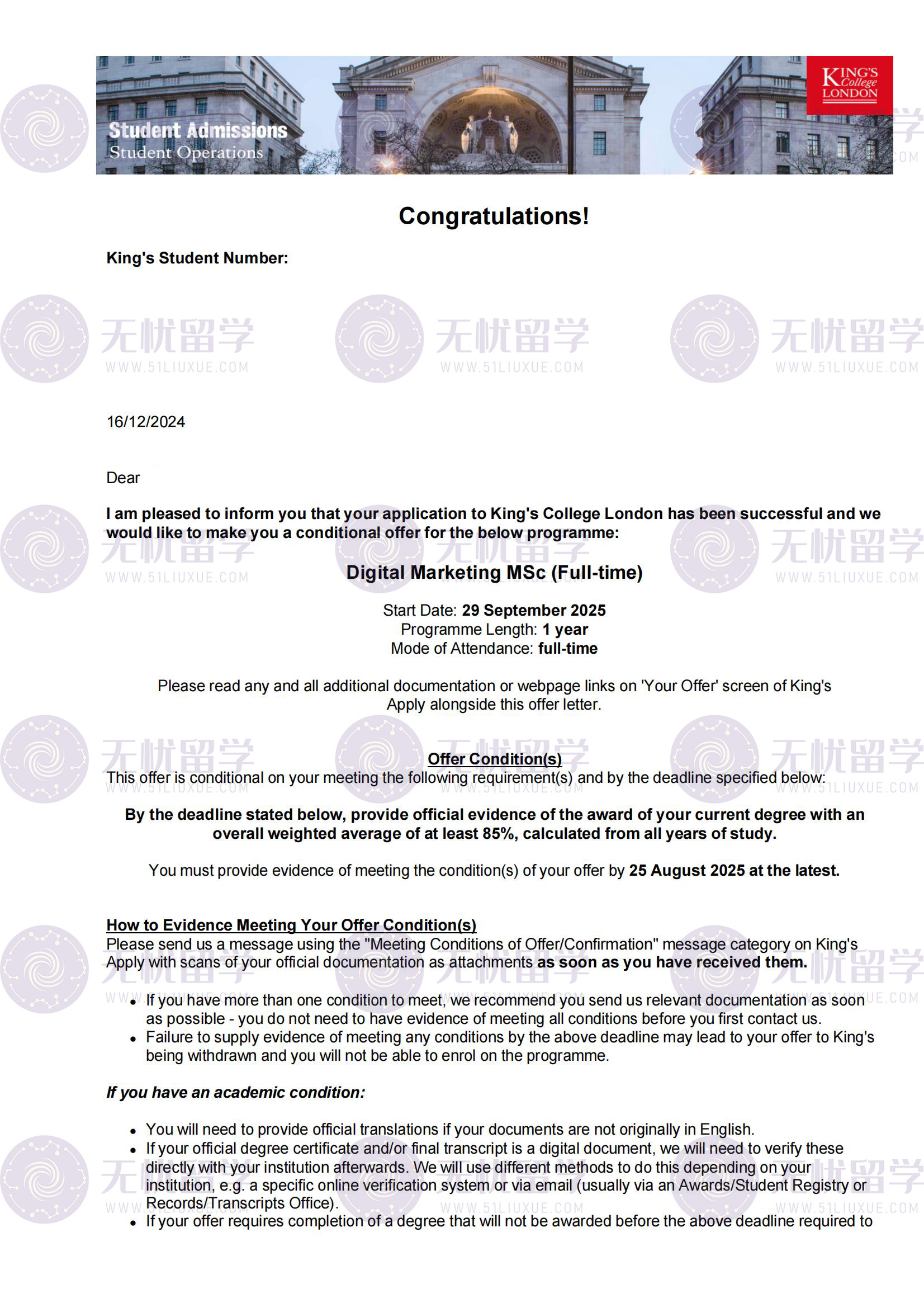 ②申请把控:英国硕士申请采用“先到先得”原则,热门项目名额紧张。无忧留学团队提前梳理KCL等院校的申请时间线,在开放申请第一时间完成材料递交;全程跟进申请进度,及时补充院校要求的补充材料,确保申请流程高效顺畅,最终Y同学在申请后6周内便收到KCL录取通知。