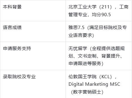 在商科赛道愈发内卷、数字营销成为热门风口的当下,精准选题成为决定英硕留学申请成败的核心关键。北京工业大学工商管理专业的Y同学,以均分90.5、雅思7.5的亮眼背景,在无忧留学的全程助力下,成功斩获伦敦国王学院(KCL)Digital Marketing MSC录取,为211学子冲击英国顶尖商科项目提供了可复制的成功范本。本文将从Y同学的申请案例切入,深度复盘 25fall 英国硕士申请选题逻辑,揭秘无忧留学如何依托专业服务,帮助学生实现背景优势与目标专业的精准匹配。