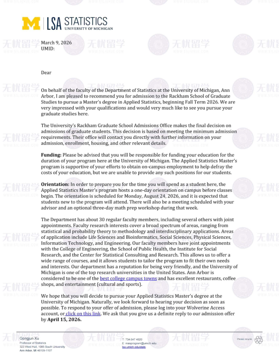 恭喜无忧留学学员L同学,985本科数学与应用数学专业,以较低的GPA2.9,不占优势的托福92,以及GRE315的成绩,成功突破GPA短板,斩获密歇根大学安娜堡分校【US News TOP20,公立常春藤】Master’s in Applied Statistics【应用统计硕士】录取!