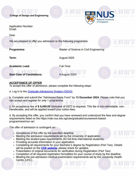 近年来,新加坡凭借顶尖的教育质量、多元的文化环境、广阔的就业前景,成为国内学子硕士留学的优选目的地,新加坡国立大学、南洋理工大学等顶尖院校更是备受追捧。作为深耕留学服务领域、专注新加坡院校申请的专业机构,无忧留学始终以“精准规划、专业赋能、全程护航”为核心,依托成熟的服务体系、资深的申请团队和丰富的成功案例,助力众多学子突破新加坡顶尖院校申请壁垒,斩获心仪offer。2025新加坡硕士申请季,无忧留学再传捷报,成功助力学子斩获新加坡国立大学土木工程硕士offer,用专业实力诠释品牌担当,为更多计划申请新加坡院校的学子提供可参考的成功范本。