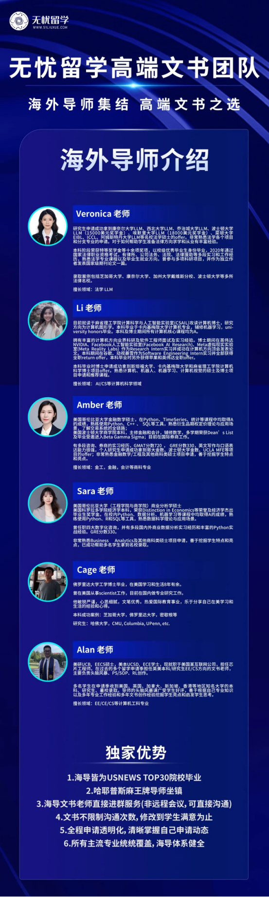 无忧留学拥有全方位的服务团队配置,采取独特的【国内顾问与国外专业方向博士顾问】联合申请模式,确保了学生在申请过程中能够得到全方位的指导和支持。