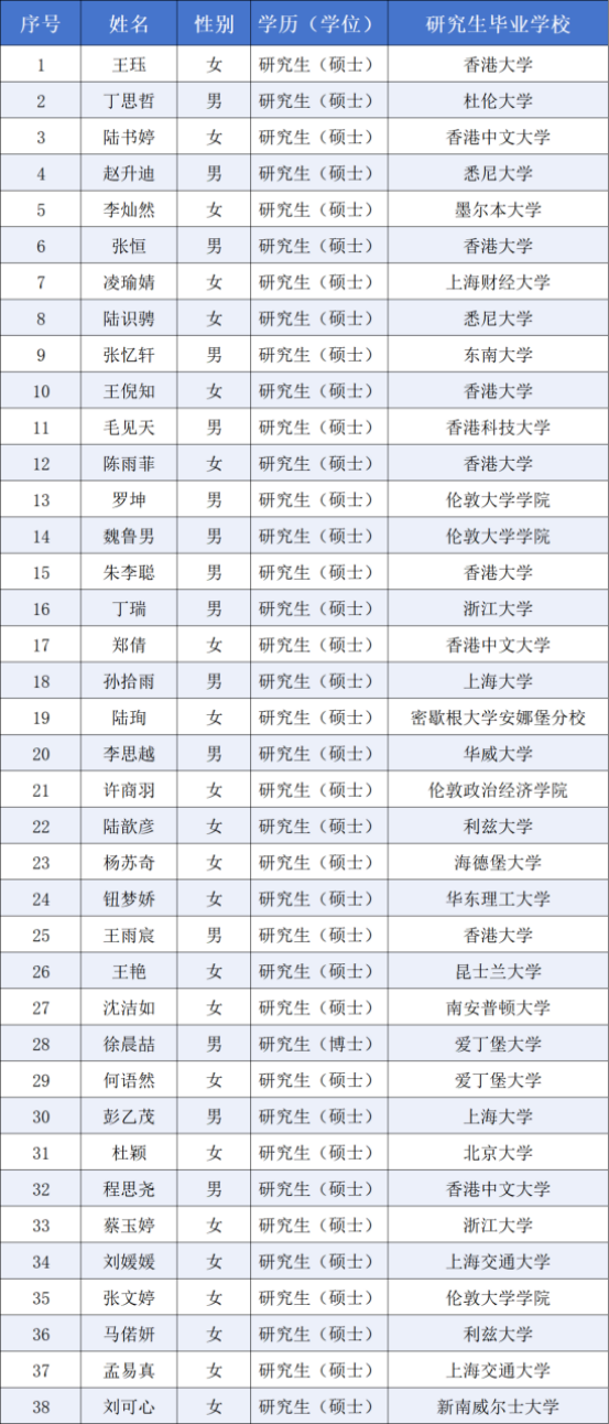 在本次公示的38名拟聘用人员中,有28人是来自国(境)外高校的硕士学历留学生,主要毕业院校包括: