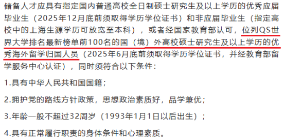经国家教育部认可,位列QS世界大学排名最新榜单前100名的国(境)外高校硕士研究生及以上学历的优秀海外留学归国人员(2025年6月底前须取得学历学位证书,并经教育部留学服务中心认证)。