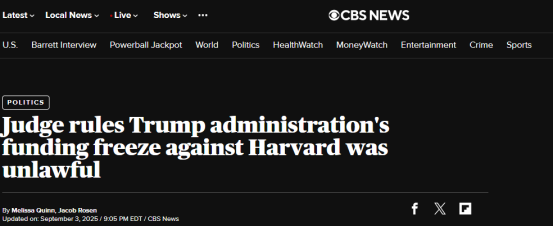 ◉ 9月3日:哈佛胜诉!特朗普政府哈佛大学超过26亿美元的研究资金的行为被裁定违法且违宪!