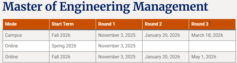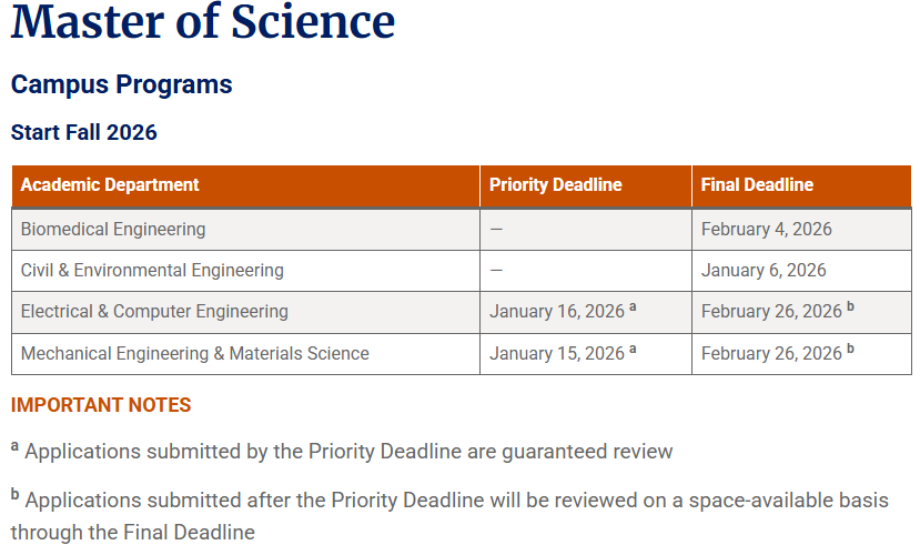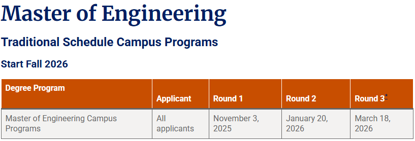 从26Fall开始,杜克大学Pratt工程学院所有MEng工程硕士项目的申请从原来的两轮改为三轮,不再沿用往年统一的1月和3月两个阶段。