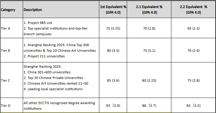 南安普顿大学26fall将中国大陆院校划分为A/B/C/D四档,具体的分数要求如下: