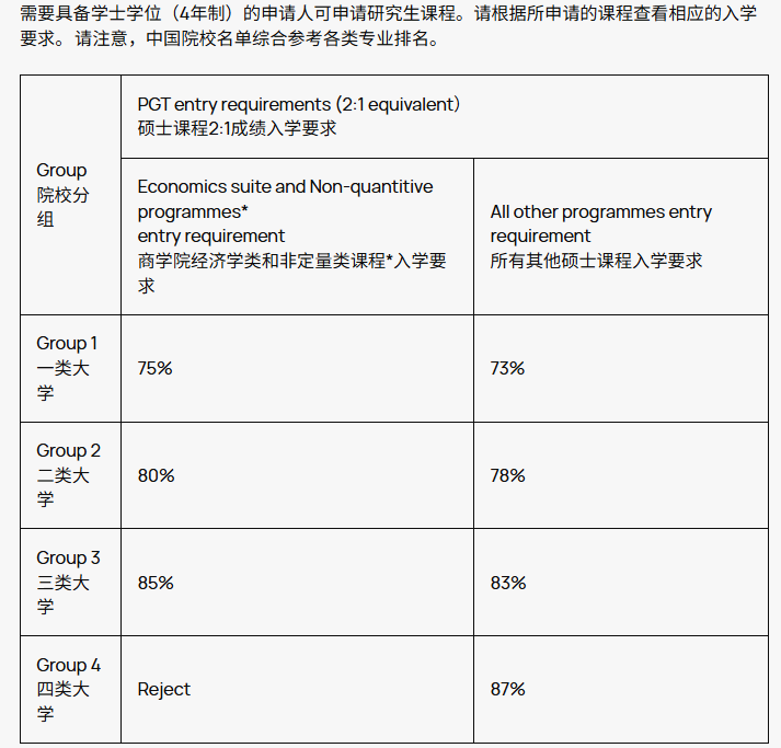 2️⃣ 均分要求下降:伯明翰大学将中国院校划分为四类:Group 1-Group 4,每档对应的分数要求有所不同,对比去年,分数普遍降低2-5分左右: