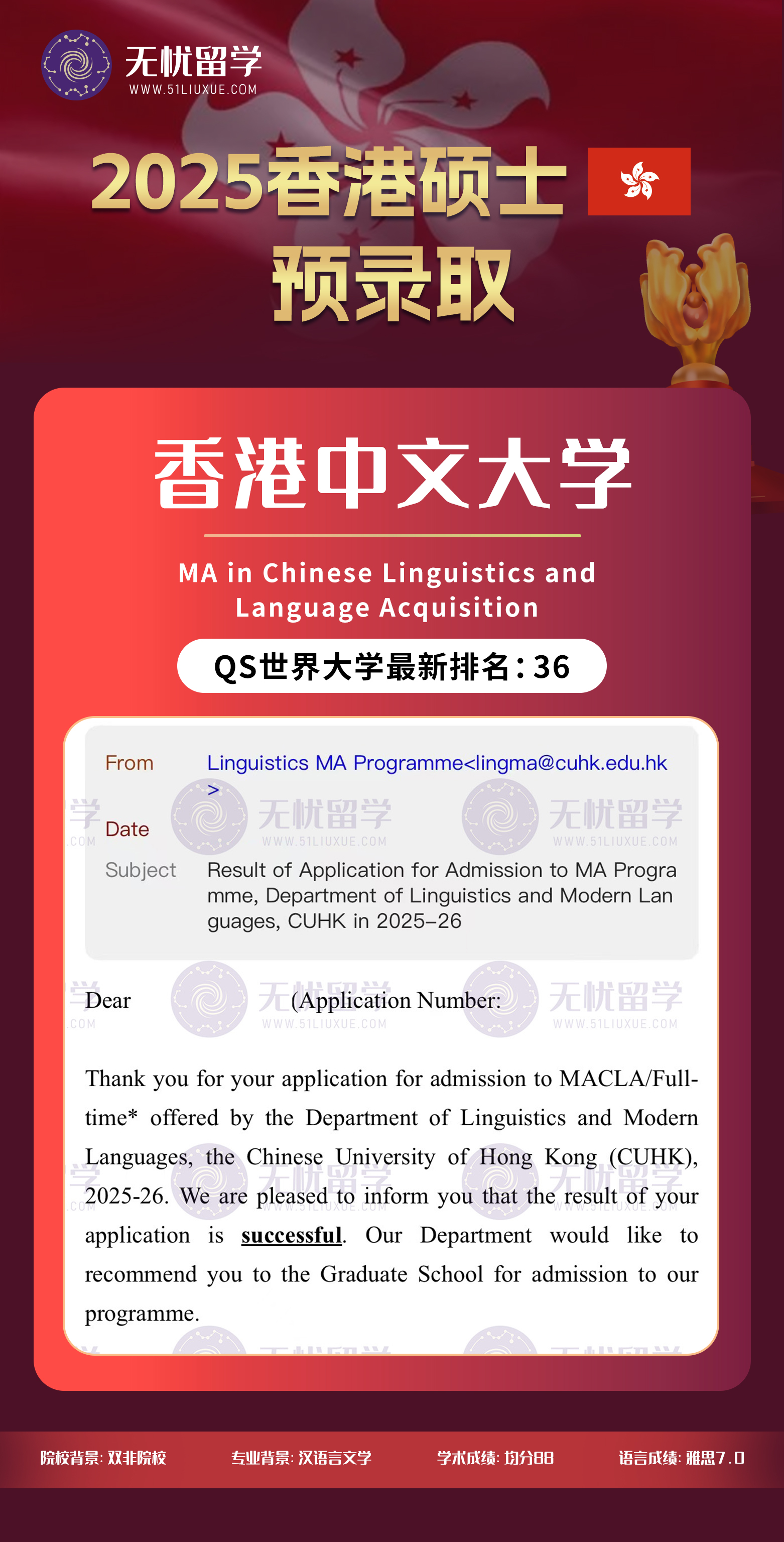无忧留学建议:学员S同学双非院校背景,汉语言专业均分88、雅思7.0,成功拿到香港中文大学offer。