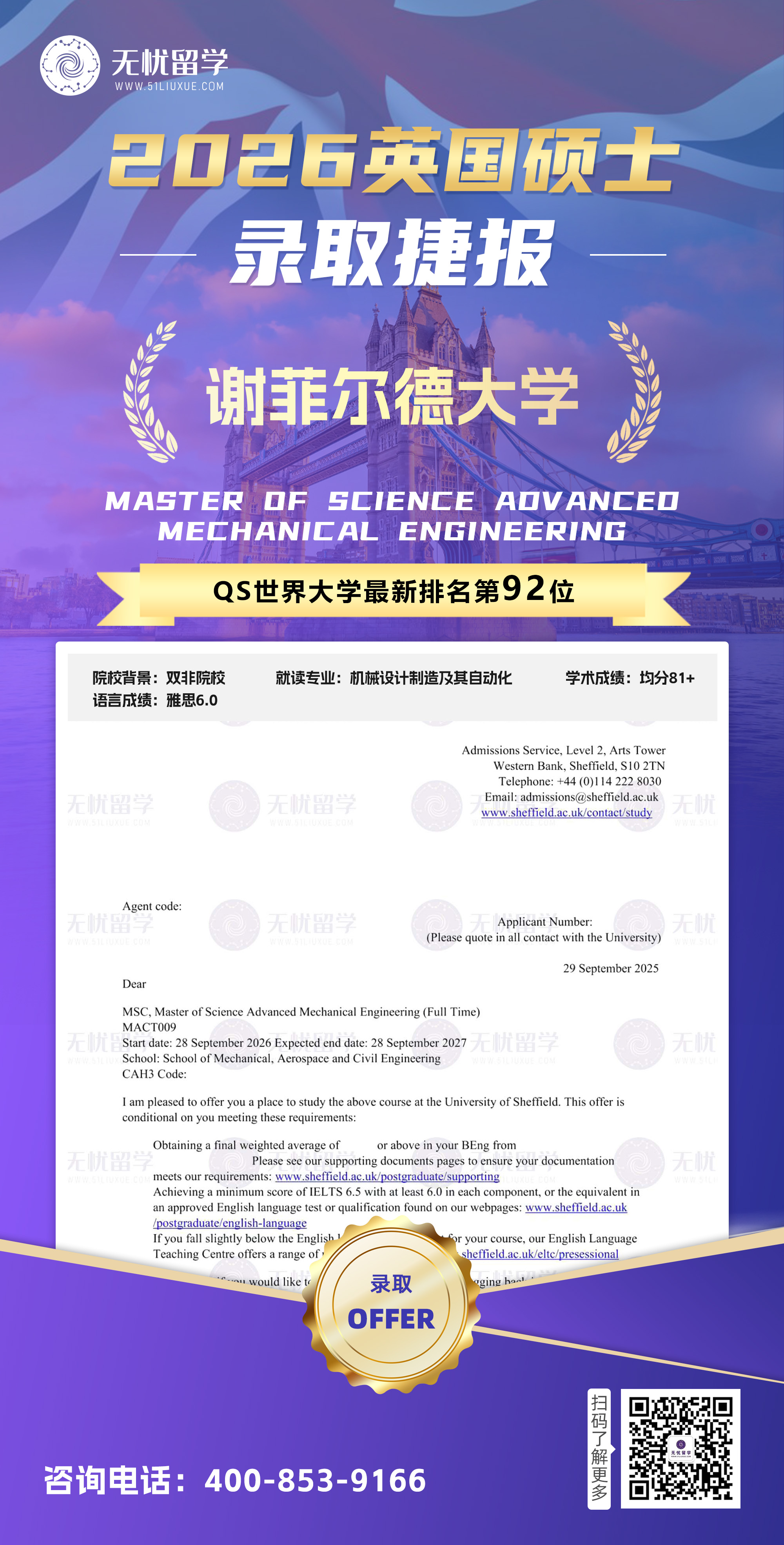 无忧留学分享:学员J同学双非院校背景,均分81、雅思6.0,成功拿到谢菲尔德大学硕士offer。