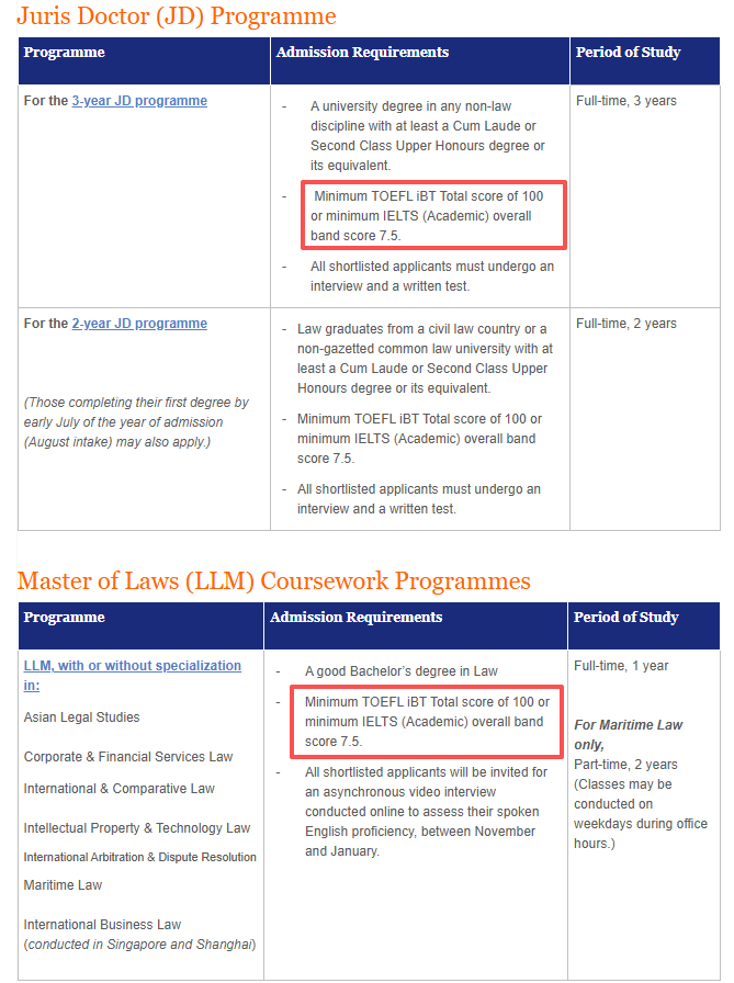 26Fall申请季,NUS法学院JD和LLM项目正式将雅思成绩要求从7.0分提高至7.5分!语言门槛明显提高,申请难度进一步加大。