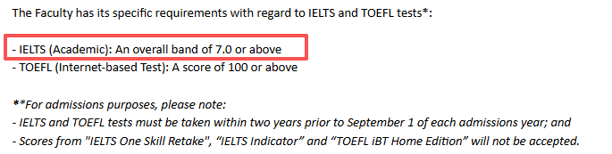 💡 根据以往录取情况来看,港大录取的LLM/MCL学生中大多数雅思总分都在7.5以上。7.0只是申请的最低标准,并不能保证录取。
