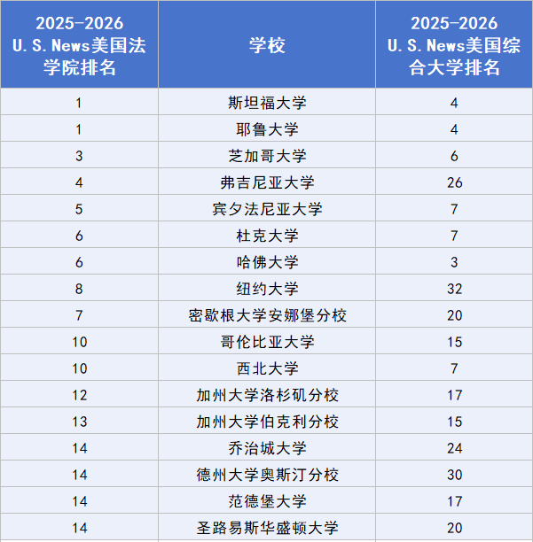 根据2025-2026年U.S.News全美最佳研究生院校排名,进入T14法学院的大学分别是: