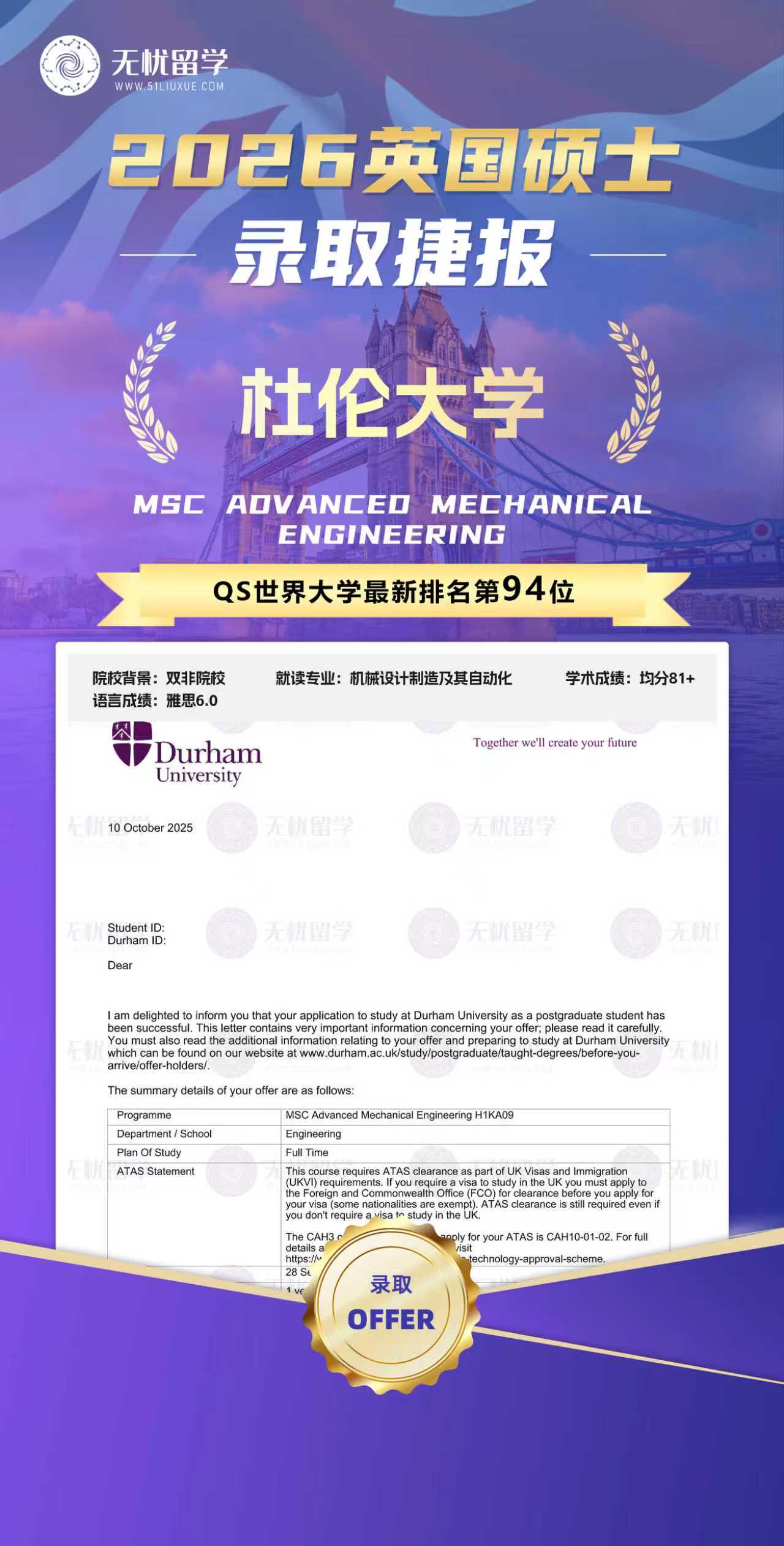 无忧留学分享:学员S同学双非院校背景,均分81、雅思6.0,成功拿到26fall杜伦大学硕士offer。