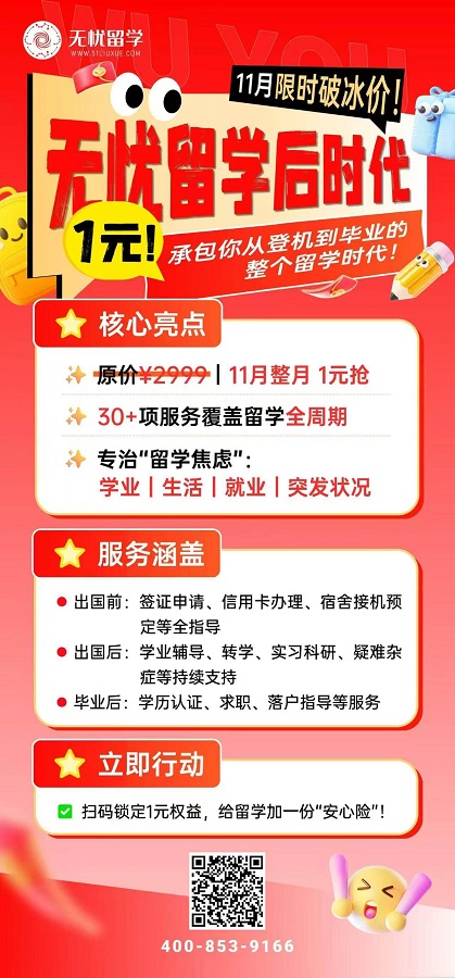 留学,从来不是学生一个人的战斗,它牵动着整个家庭的心。正是深刻理解这份牵挂与痛点,我们在今年11月倾情推出【无忧留学后时代】大礼包,以1元破冰价开启“全程陪跑” 服务,承包你从登机到毕业的每个关键节点。