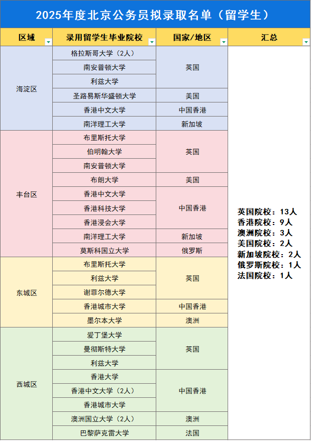 近年来,在“学历通胀”和“就业内卷”的大环境下,留学生群体正成为“国考”大军中一股不可忽视的力量。那么,究竟哪些海外院校的毕业生更受体制内招聘中更受青睐呢?不妨一起看下2025北京市公务员的留学生录取名单。
