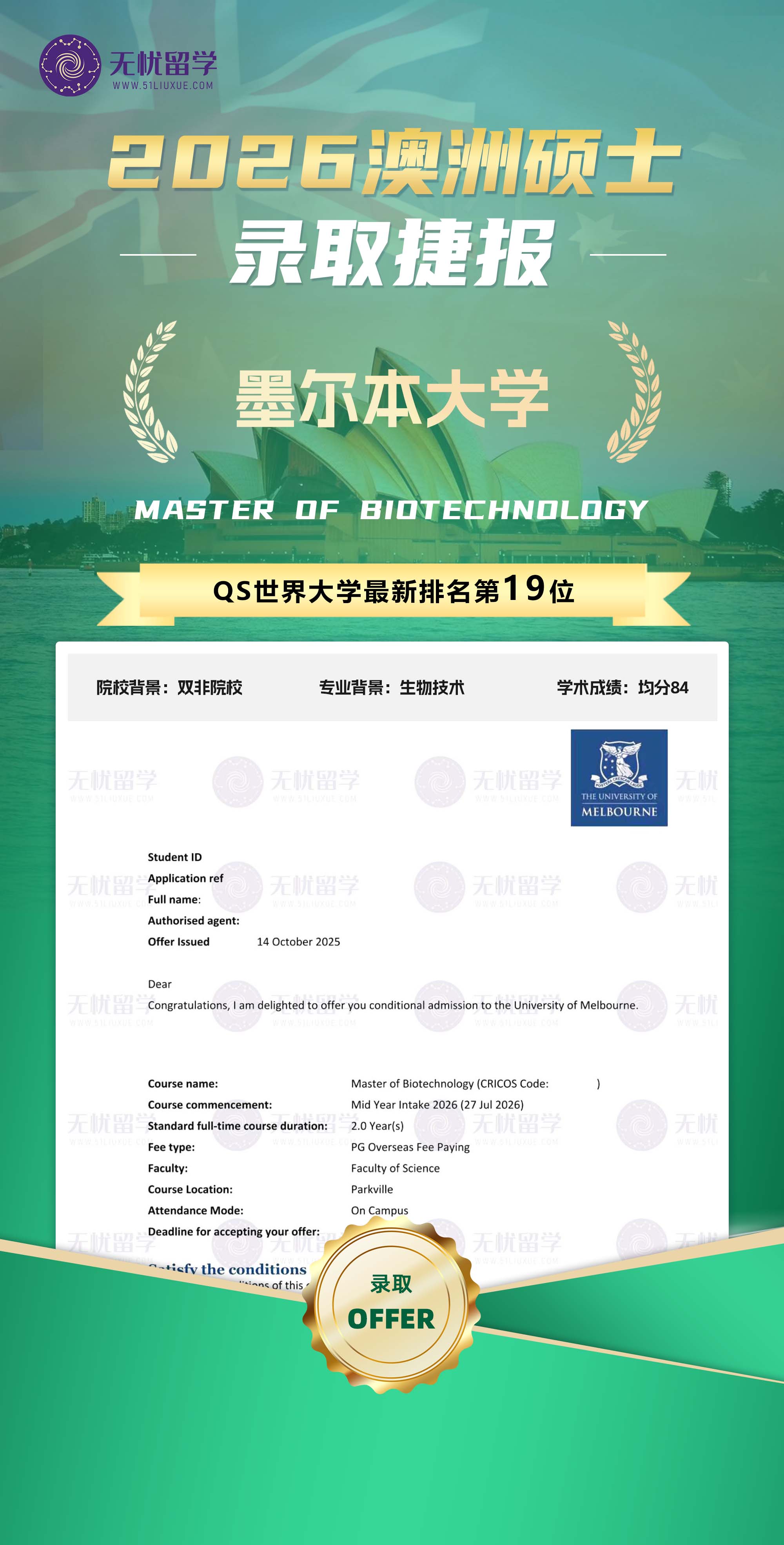 无忧留学分享:学员W同学双非院校背景,生物专业均分84,成功拿到26fall墨尔本大学硕士offer。