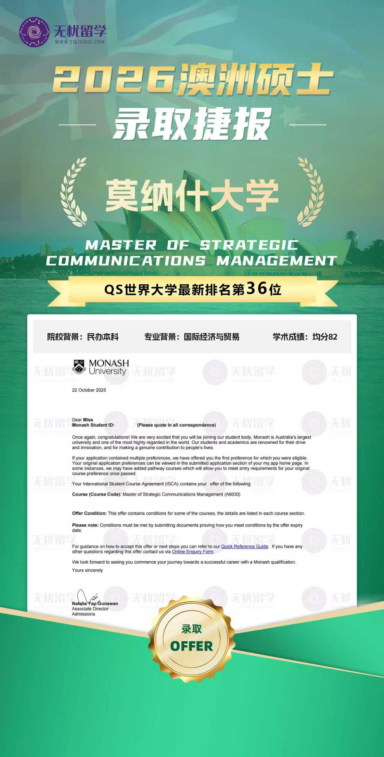 无忧留学分享:学员S同学民办本科院校背景,均分82,成功拿到26fall莫纳什大学硕士offer。