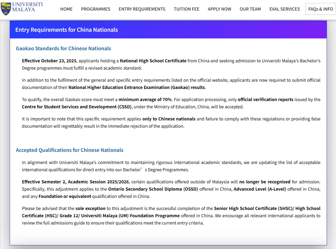 近日,马来亚大学宣布自2025/2026学年第二学期起实施重大招生改革:全面停止接受中国学生的OSSD、A-Level、AP等国际课程成绩直录本科,仅接受高考成绩(需达总分70%及以上,相当于525分/750分制)申请。