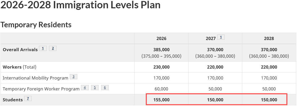 去年,政府计划在2026年发放305,900份学生许可,2027年发放305,900份。然而,预计数字将减少一半以上,政府计划在2026年将发放的学生许可数量减少至15.5万份,并在接下来的两年里每年减少到15万份。