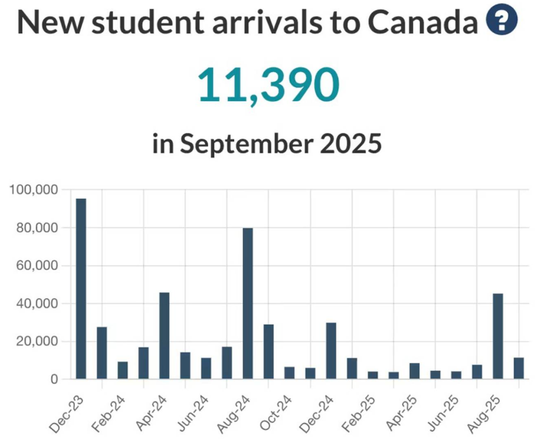 具体来看,2025年1月至9月期间,加拿大新入境的国际学生人数比去年同期减少了60%减幅达到了150,220人。