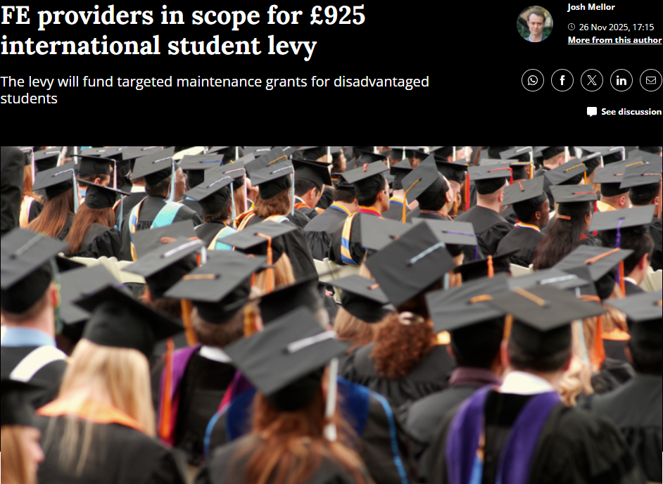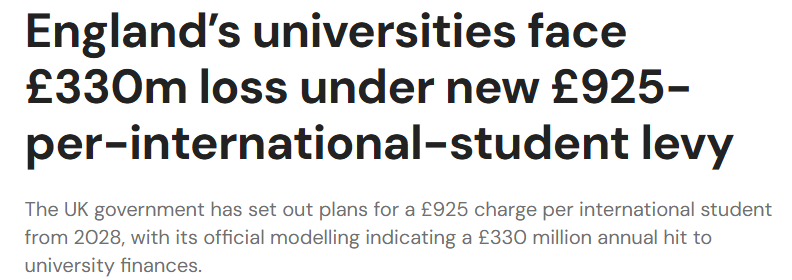 自2028年8月1日起,所有英格兰大学需为每位国际学生每年支付925英镑的固定费用。该税款将由英国学生事务办公室收取,适用于所有招收国际学生的高等教育机构。